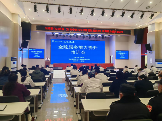 为全面贯彻落实国家《改善就医体验 提升患者体验主题活动方案(2023-2025年)》及甘肃省卫生健康委联合省中医药管理局《全省医疗机构开展“十个多一点”暖心行动实施方案》,结合甘肃省卫生健康委近期发布的2023年度全省公立医院满意度调查结果,全面提升医院医疗服务质量,提高人民群众就医获得感、幸福感、满意度,2024年12月5日,兰州石化总医院(甘肃中医药大学第四附属医院)在临床教研中心召开“全院服务能力提升培训会”,党委书记刘永斌、院长、党委副书记蒲华云、副院长姜晓梅、纪委书记杨斌及全院相关科室主任、护士长、窗口工作人员、保安、保洁负责人等共计140余人参会。培训会由副院长姚晓斌主持。
