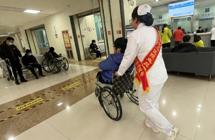 另一位导诊护士见状,立即推来轮椅,小心翼翼搀扶她坐稳,一边用柔声缓解患者的焦虑,一边耐心解释“头晕伴行动障碍需挂神经内科”,随后还主动帮她完成挂号。考虑到患者行动不便,护士又全程护送她前往神经内科诊室,途中始终轻声叮嘱;到诊室后,还协助患者与医生清晰沟通病情,直至住院证顺利开具。服务并未在此止步:护士继续推着轮椅将女士送至住院部,与住院部医护人员逐项仔细交接患者症状、就诊情况,甚至主动代办了住院手续。全程下来,患者真正实现了“零跑腿”。看着手续顺利办结,女士终于卸下满脸焦虑,连连向医护人员道谢,话语中满是真切感激。这样的暖心场景,在医院并非个例。平日里,佩戴“志愿者”绶带的医护人员始终坚守一线:从指引挂号到轮椅护送,从解答流程疑问到协助住院交接——每一个细节,都凝聚着“以患者为中心”的服务初心。她们以一次次主动担当、一趟趟耐心护送,不仅简化了就医流程、缓解了独自就诊的不安,更让原本略显冰冷的医疗环节,盈满了人文暖意。