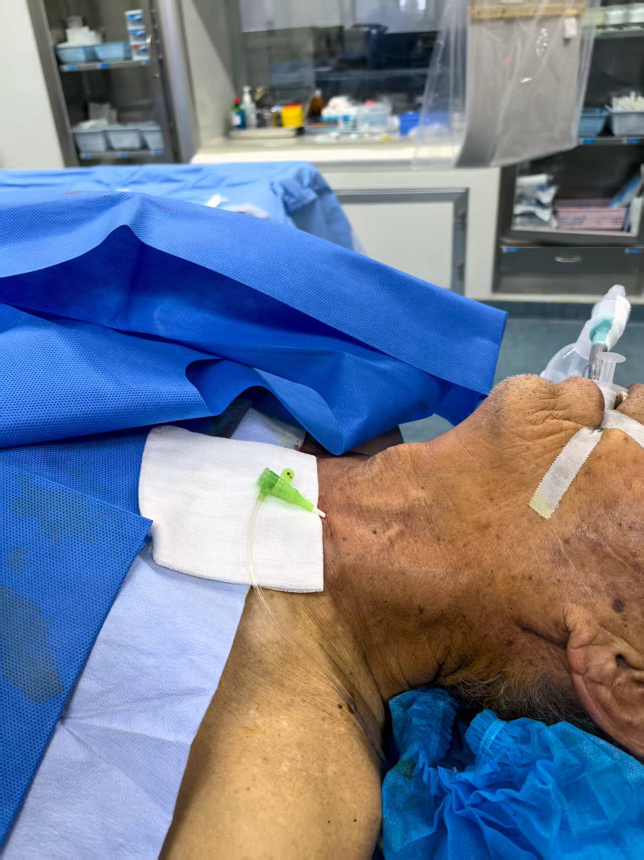 “准备经颈动脉穿刺!”在紧要关头,马磊主任审时度势,果断做出了一个大胆而精准的决策——立即更换手术路径,直接从颈部颈动脉建立通路。这条“捷径”能直抵病灶,完美避开复杂的主动脉弓,但颈部血管穿刺本身风险高、操作空间小,在争分夺秒的急诊中极具挑战性,极其考验主刀医生的技艺与胆魄。指令既出,团队高效协同。定位、消毒、穿刺、置管……所有步骤在马磊主任手中稳而有序。当导管经由这条新开辟的“颈部生命线”成功抵达堵塞点,并一次性取出致命血栓时,造影屏上血流瞬间恢复的影像,让手术室内所有悬着的心终于落下。