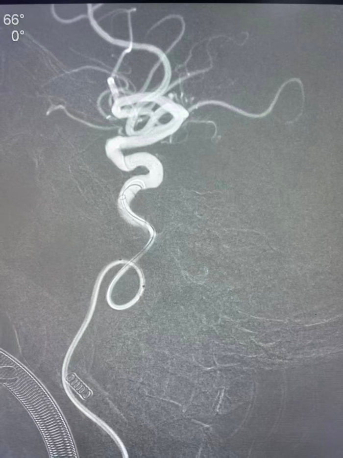 然而,就在手术团队准备通过常规的股动脉路径进行取栓时,血管造影结果却让所有人心头一紧。患者不仅大脑中动脉闭塞,还天生伴有“三型主动脉弓”合并“牛角弓”的极端复杂的血管结构。形象地说,常规的介入路径如同从“主干道”(股动脉)绕行一个平缓的“立交桥”(主动脉弓),再驶入“脑部支路”(颈动脉)。但患者的“立交桥”坡度异常陡峭(三型弓),且“支路”的出口还是角度刁钻的“牛角弯”(牛角弓),导致导管导丝屡次尝试都无法稳定到达目标位置。常规通路宣告失败,手术陷入僵局,监护仪上的每一次跳动都在提醒着,患者脑内缺血的范围正在不断扩大。