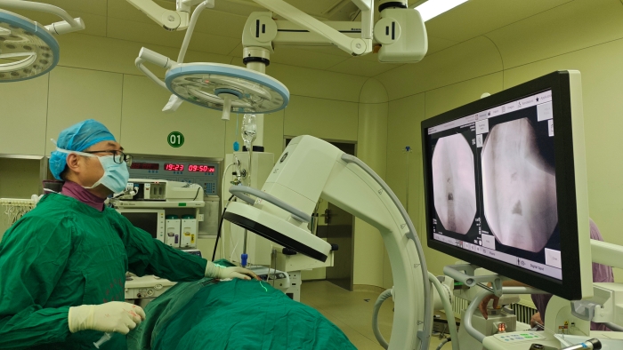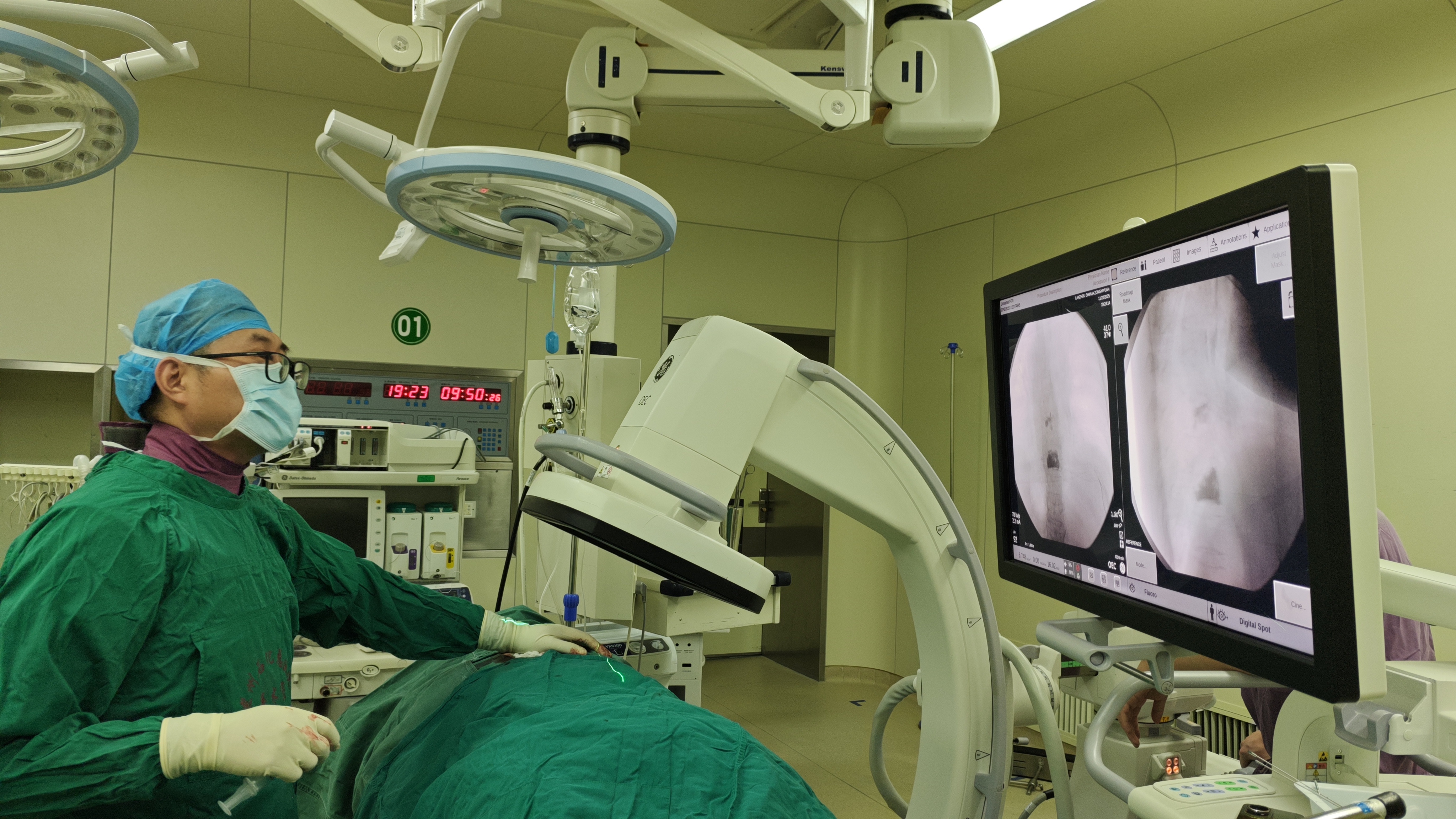 下午17:00,一位因严重骨质疏松导致椎体压缩性骨折的老奶奶,正俯卧在手术台上,疼痛让她无法翻身,更别提正常行走了,疼痛科瞿创业主任正在为她进行椎体成形术,在X光的引导下,穿刺针精准地直达病变椎体,将高粘度“骨水泥”缓缓注入塌陷的椎体,几分钟后,水泥凝固,原本破碎的椎体被瞬间加固,对于患者而言,剧痛消失、治疗即刻生效。