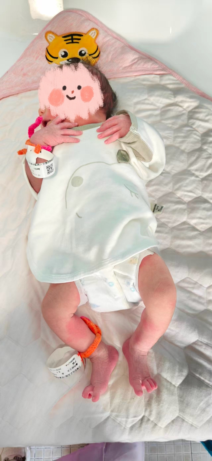 于是,一个独特的改良方案诞生了!选用柔软亲肤的花色冰条线,先温柔地系在宝宝的小手腕和脚踝上,再将身份腕带巧妙地穿在冰条线上。冰条线柔软、透气,完美避免了传统腕带可能带来的摩擦和压痕,像给宝宝戴上了一圈柔软的“云朵”。腕带通过冰条线进行二次固定,更加稳妥,不易脱落,牢牢守住了安全底线。这小小的“花色线”,在传统习俗里,有着为新生儿 “拴住福气、保佑平安”的美好彩头。它不仅仅是一个固定工具,更是妇儿专科护理小组送给宝宝的第一份手作礼物,承载着全体医护人员最真挚的祝福。