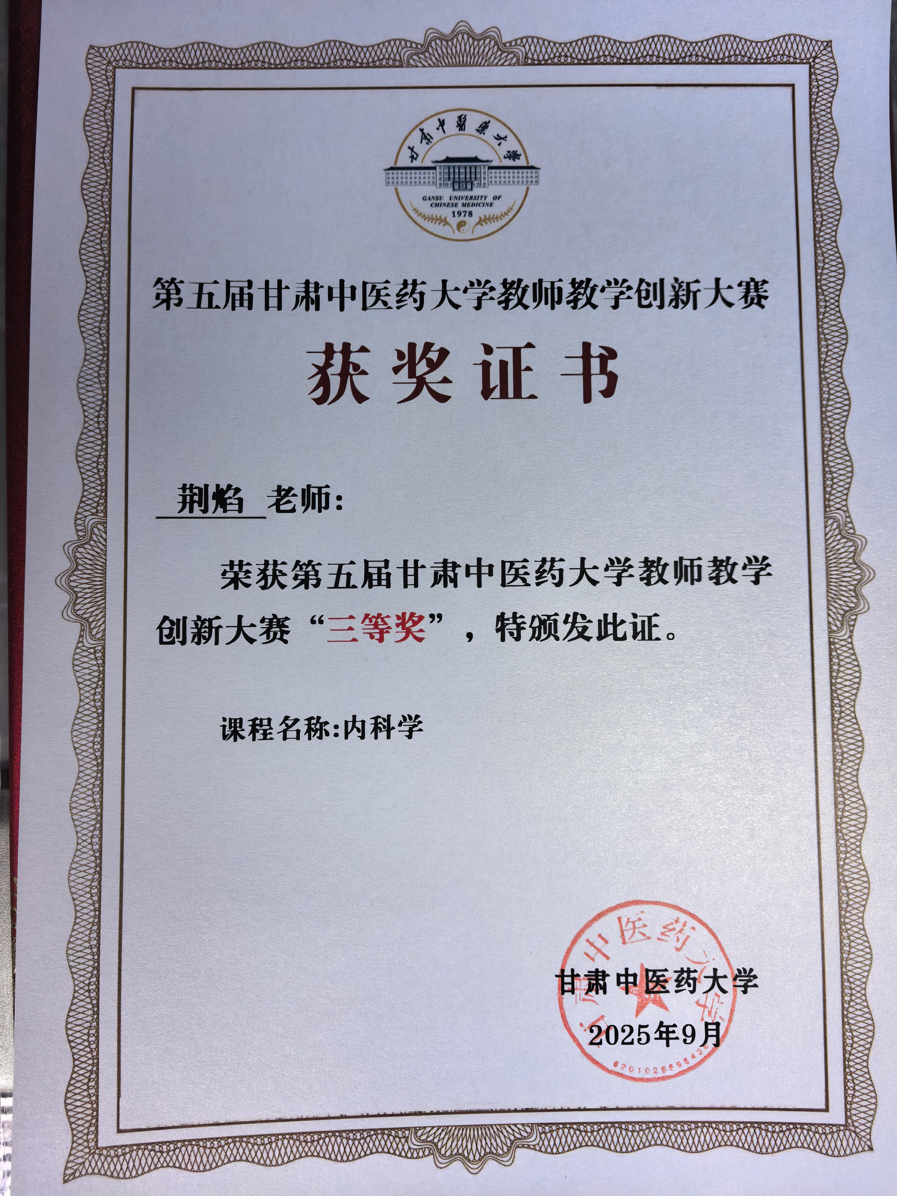 本次大赛以推动教学改革、提升教师教学创新能力为目标,吸引了全校各学院众多教师参与,经过层层选拔最终确定获奖名单。作为硕士研究生导师、甘肃省卫生健康骨干人才,荆焰教授深耕医教领域多年,此次参赛围绕教学理念革新、方法优化等核心维度展开汇报,其分享的教学创新举措紧密结合内科教学实际,在教学内容与临床实践融合、教学手段数字化升级等方面的探索,展现出鲜明的实用性与前瞻性 。