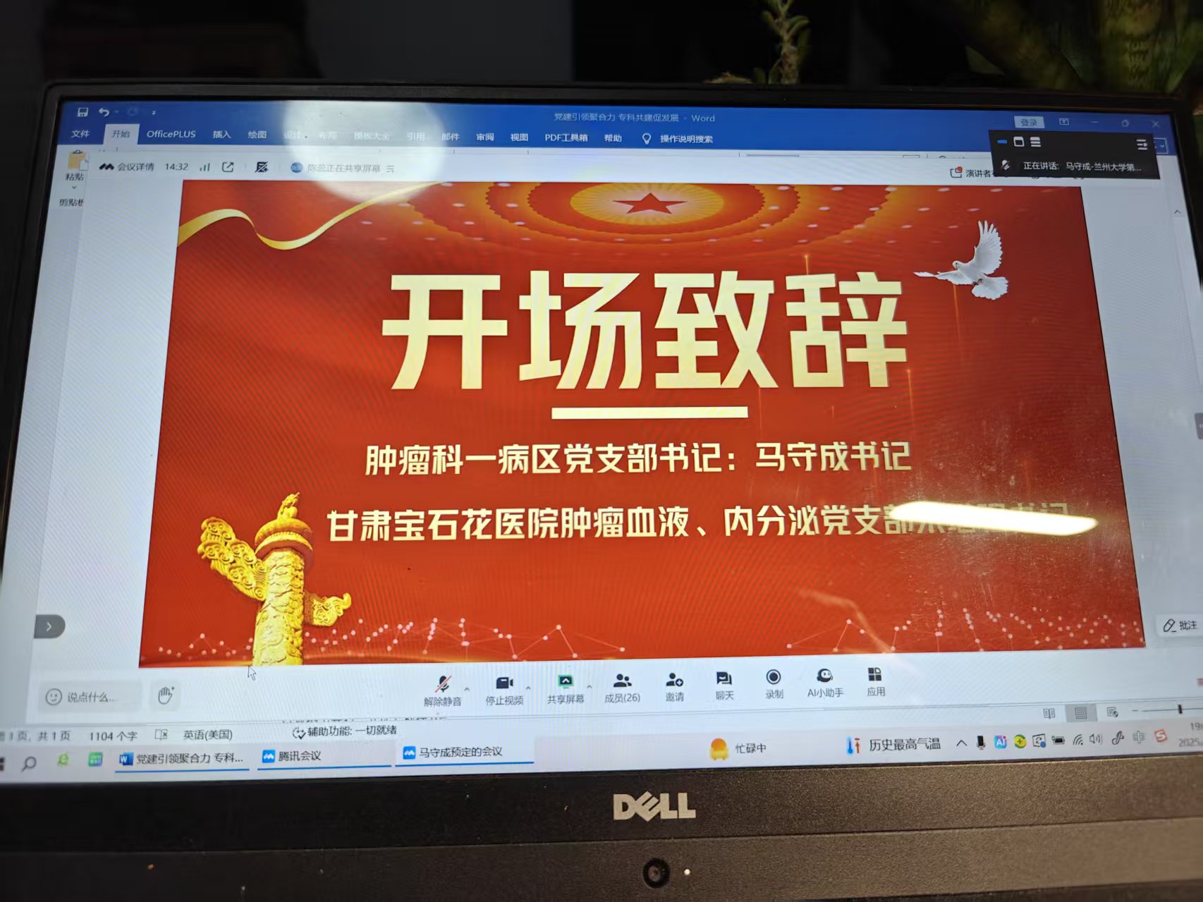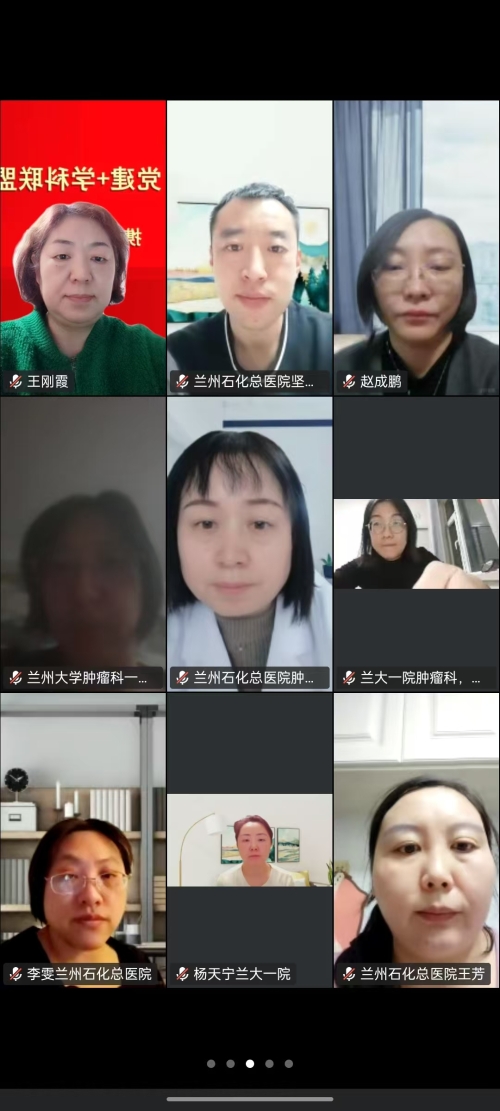 2025年12月17日,由兰州石化总医院(甘肃中医药大学第四附属医院)肿瘤血液科内分泌肾内科党支部与兰州大学第一医院肿瘤科一病区党支部联合主办的“党建引领聚合力·专科共建促发展——线上共享党课暨肿瘤防治知识学习会”通过腾讯会议平台顺利召开。两院共计31名党员、入党积极分子及业务骨干齐聚云端,以党建为纽带,深化专科协作,共谋肿瘤防治新发展。