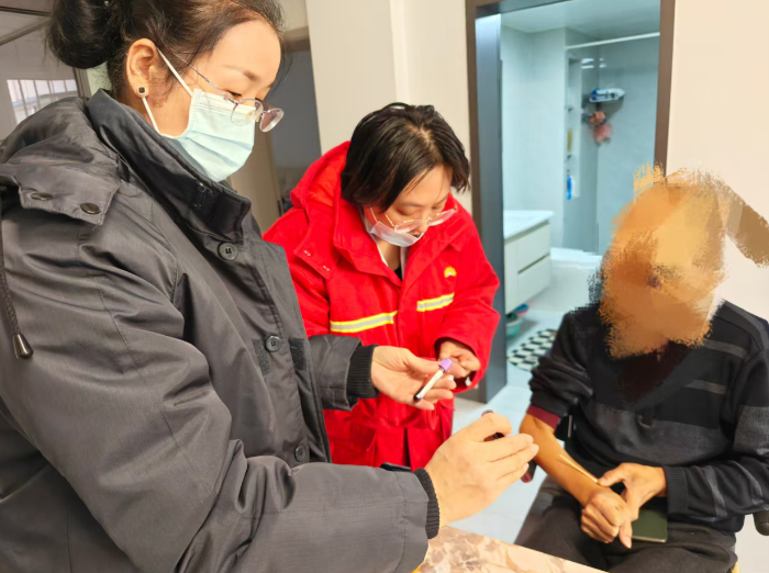 在患者家中,党支部书记朱增强、肿瘤血液科护士长屠文英和主管医生李雯组成的服务小队,为患者进行了细致的身体状况评估和简单的查体。面对患者的痛苦和家属的焦虑,他们耐心安抚,并现场为患者完成了采血服务。服务小队将血样带回医院后,立即送往检验科进行紧急检测。