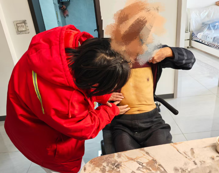 此次服务的对象是一位66岁的男性肺癌脑转移患者。疾病导致他言语不清、下肢行动不便,因此未能按疗程进行规律治疗。科室主管医生李雯曾多次电话联系,但患者均未前来就诊。前日,患者家属焦急地联系到科室,反映患者近期出现严重食欲不振、全身皮肤黄染并伴有腹痛等症状。了解到患者因身体原因无法下楼,不愿到医院就诊的困境后,党支部迅速响应,立即组织党员突击队前往患者家中。