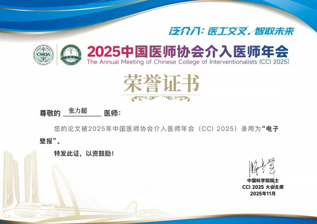 张力超医生报道的病例,聚焦于维持性血液透析患者常见的临床难题——中心静脉导管功能不良。论文详细介绍并分析了一例采用“经股静脉路径行导管纤维蛋白鞘球囊扩张术”成功解决该问题的个案。纤维蛋白鞘形成是导致长期留置透析导管血流不畅、无法达到处方流量的重要原因之一。相较于传统的导管更换或溶栓治疗,该项介入技术通过微创的球囊扩张方式,直接处理纤维蛋白鞘,有望更高效、持久地恢复导管功能,为处理此类并发症提供了新的技术思路和实操借鉴。该成果被大会录用,体现了国内权威学术机构对该病例处理策略的创新性及临床价值的认可,也反映了我院在血液透析相关并发症的介入治疗方面进行的积极探索。