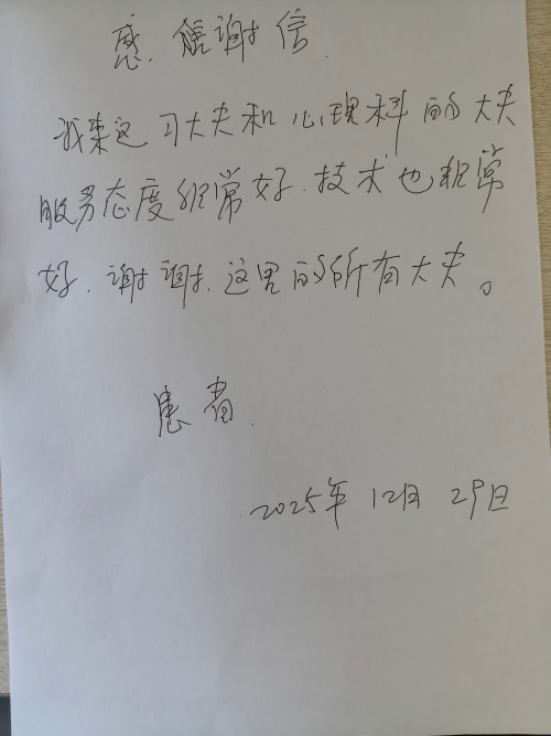 2025年12月29日,刘女士第四次复诊,说“我现在没有任何躯体不适感一下子感觉心静了,非常感谢每一位为我付出的医务人员”,并当场写下感谢信。