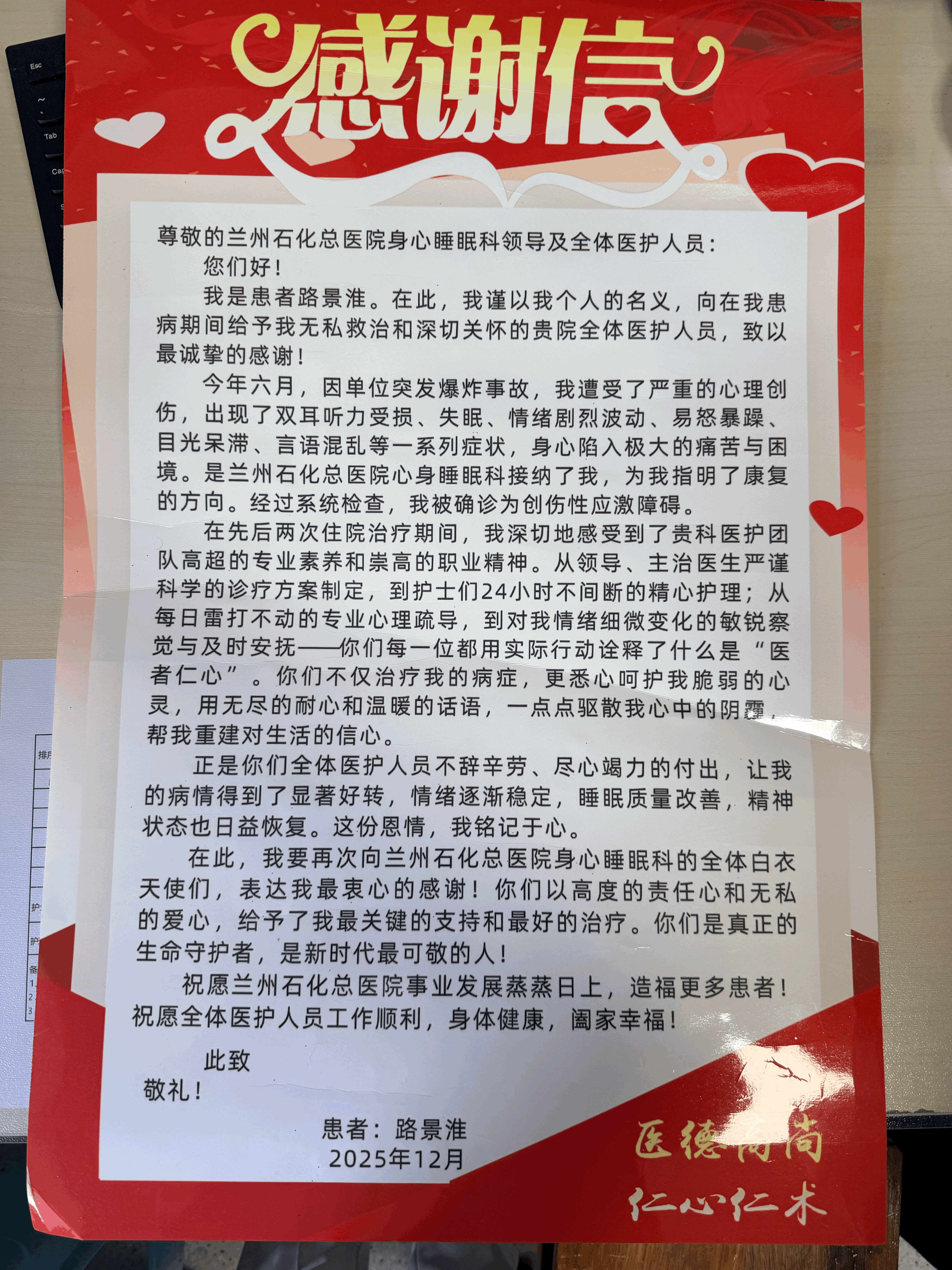 一封感谢信,是患者对医护人员的最高赞誉,更是医疗服务质量的生动见证。对于心身与睡眠医学科医护人员而言,这份认可既是鼓励,更是责任。未来,科室将继续坚守初心、精进技艺,不断提升诊疗水平与服务质量,用爱与专业守护每一位患者的身心健康,让更多身处身心困境的人,都能在温暖的陪伴与科学的救治中,重获新生、拥抱阳光。