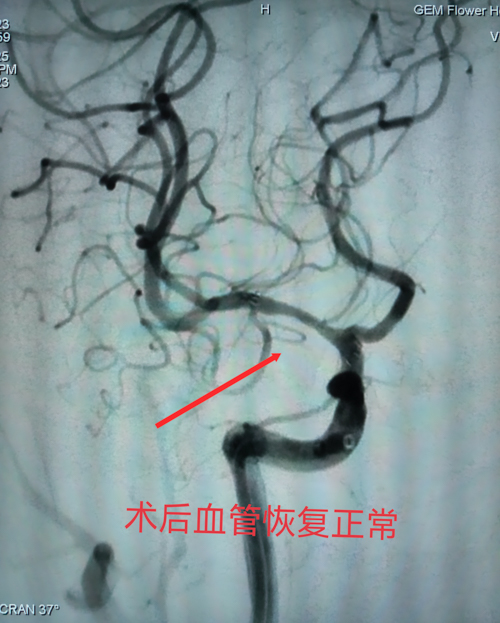 经过多学科会诊和周密术前准备,正月十五,手术在介入手术室紧张展开。正如术前预判,患者血管路径异常迂曲,狭窄段位于大脑中动脉分叉远端。“注意微导丝头端塑形角度,保持推进速度......”马主任紧盯显示屏,双手精准操控着细若发丝的介入器械,当脑血管支架完美贴合血管壁时,复查造影显示血流恢复通畅,手术室顿时响起掌声。这类手术堪称“在豆腐上雕花”。