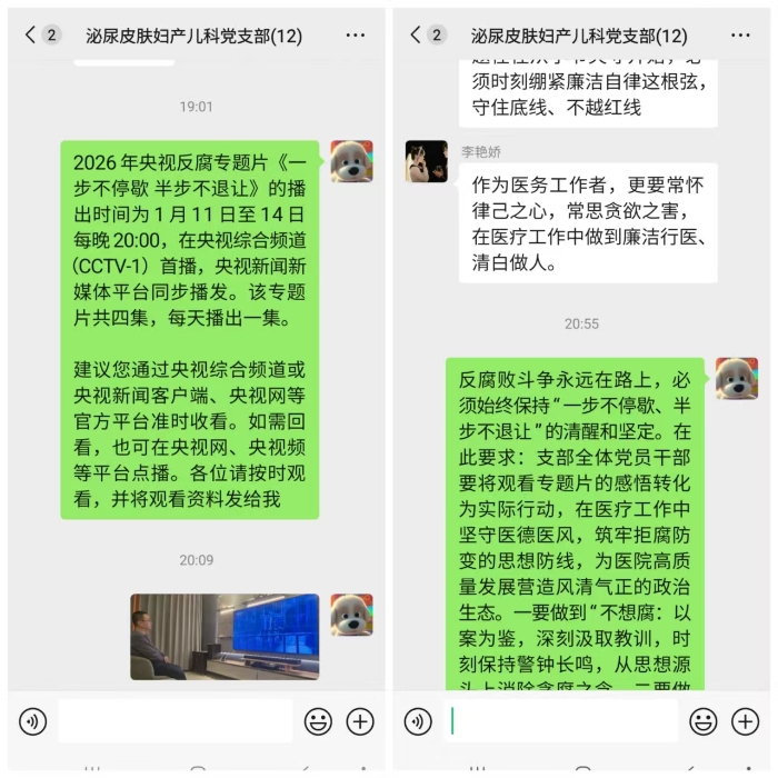 为深入贯彻落实全面从严治党要求,持续深化党风廉政建设和反腐败斗争,2026年1月11日晚,兰州石化总医院(甘肃中医药大学第四附属医院)泌尿皮肤科妇产科儿科党支部组织全体党员干部,按时收看由中央纪委国监委宣传部与中央广播电视总台央视联合摄制的反腐专题片《一步不停歇 半步不退让》第一集,并以此为主题开展主题党日活动。活动由党支部书记赵小洲主持,支部全体党员、入党积极分子及科室骨干共12人参加。