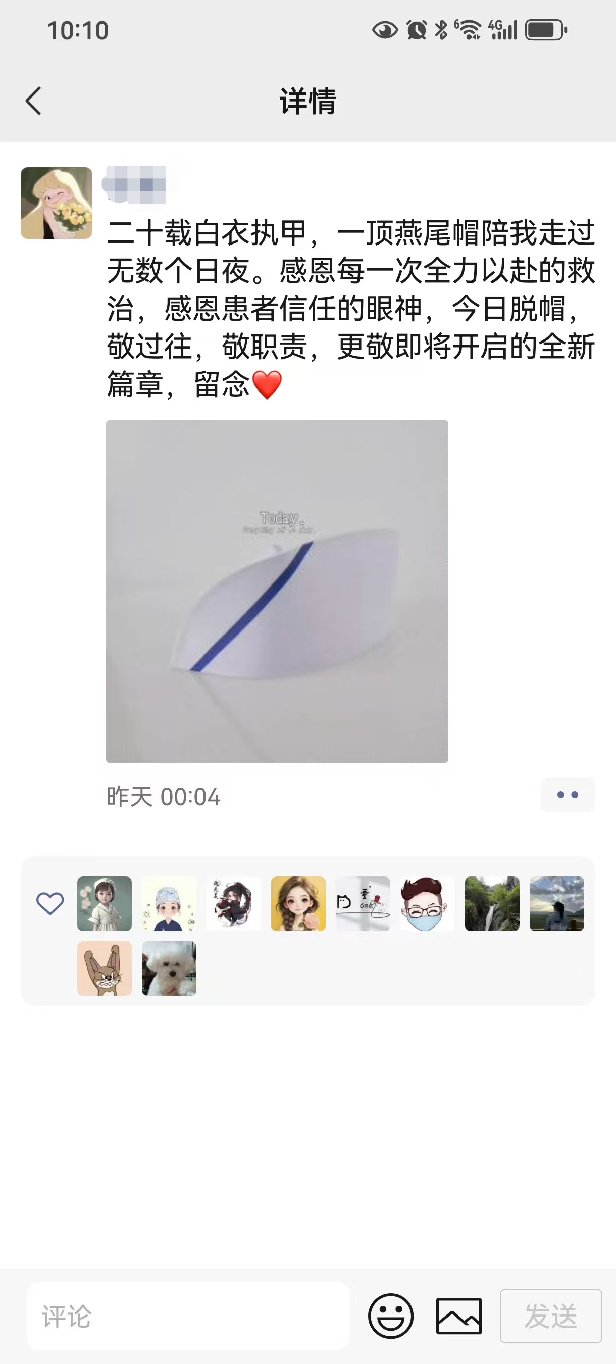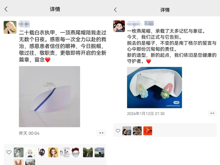 仪式结束后,朋友圈悄然发生着变化。有人拍下对折整齐的燕尾帽,配文“今日脱帽,敬过往,敬职责,更敬即将开启的全新篇章”;有人分享摘下帽子后清爽的自拍,写道“一枚燕尾帽,承载了太多的记忆与象征,脱去的是帽子,不变的是那沉甸甸的责任。”那些没有说出口的感慨,那些交织着不舍与轻盈的复杂心绪,在九宫格里找到了安放的角落。点赞和评论里,是同道中人最懂的理解与祝福。