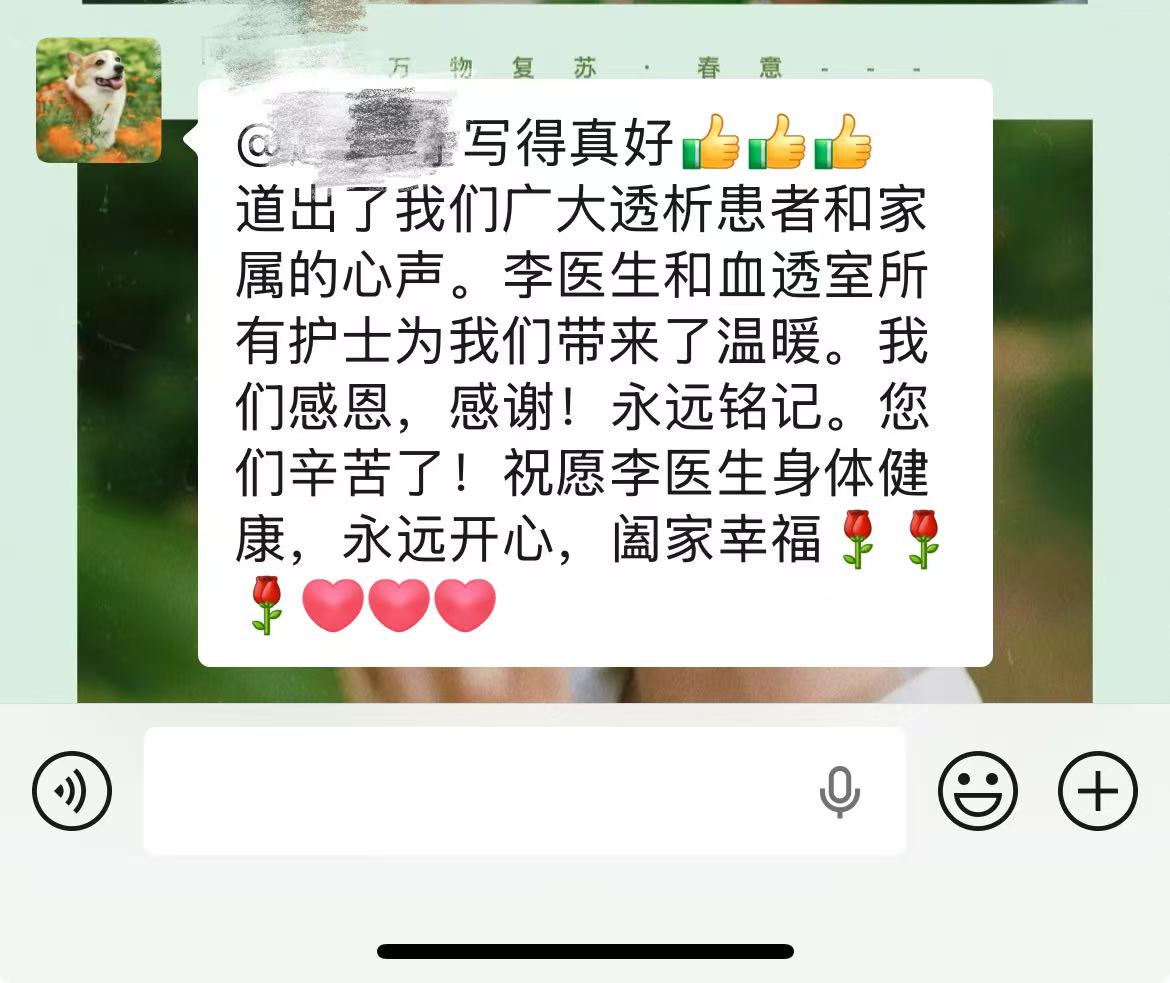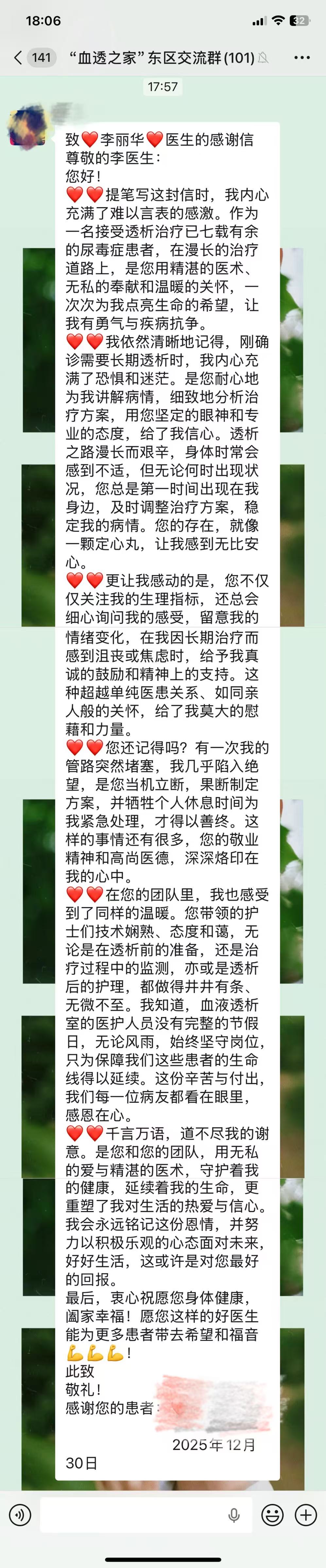提笔写这封信时,我内心充满了难以言表的感激。”这是一位接受透析治疗七载有余的患者的心声。信中,患者回忆起初诊时的恐惧迷茫,是李医生耐心讲解病情、细致分析方案,用专业与坚定驱散了他心中的阴霾;透析路上身体突发不适,她总是第一时间调整治疗方案,让病情化险为夷;就连管路堵塞的紧急时刻,她也牺牲休息时间当机立断处理,用精湛医术挽回希望。