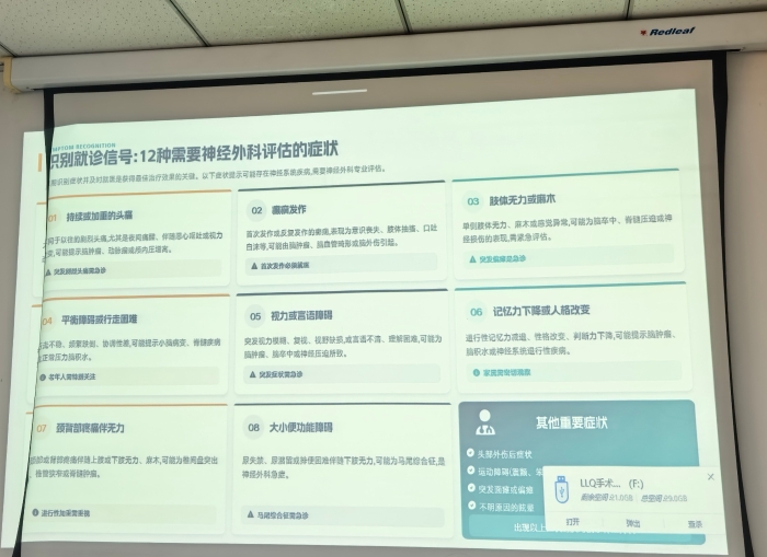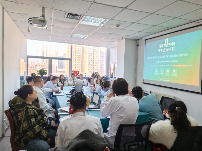 就诊指征识别是本次培训的重点内容。李主任从常见的12种需神经外科评估的关键症状,逐一讲解识别要点与分诊原则:持续或加重的头痛,尤其是夜间痛、伴恶心呕吐或视力改变,突发剧烈头痛需按急诊处理;癫痫首次发作或反复发作,需紧急排查病因;单侧肢体无力或麻木、突发偏瘫,警惕脑卒中、脊髓压迫;平衡障碍、行走困难,提示小脑或脊髓病变,老年人需重点关注;突发视力模糊、言语不清,可能为脑肿瘤、脑卒中所致急症;记忆力进行性下降伴人格改变,需排查脑肿瘤、脑积水等问题;颈背部疼痛伴无力且进行性加重,要重视椎间盘突出、脊髓肿瘤可能;大小便功能障碍伴下肢无力,警惕马尾综合征等急症。同时,头部外伤后异常症状、运动障碍、不明原因眩晕等情况,也需及时引导患者至神经外科评估。为方便门诊人员快速记忆,主任还将核心指征总结为“痛、晕、抽、抖、瘫、不稳、不语、麻木、失禁、痴呆”等关键词,帮助大家筑牢分诊第一道关口。在先进诊疗技术板块,李立强主任讲解了科室微创、介入、神经内镜、精准导航等前沿诊疗技术,让门诊人员熟悉科室技术优势与诊疗特色,既能在分诊时精准对接患者需求,也能在健康宣教、患者咨询中准确解答,做好科室诊疗优势的宣传员。