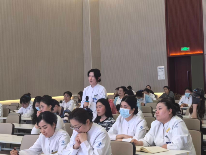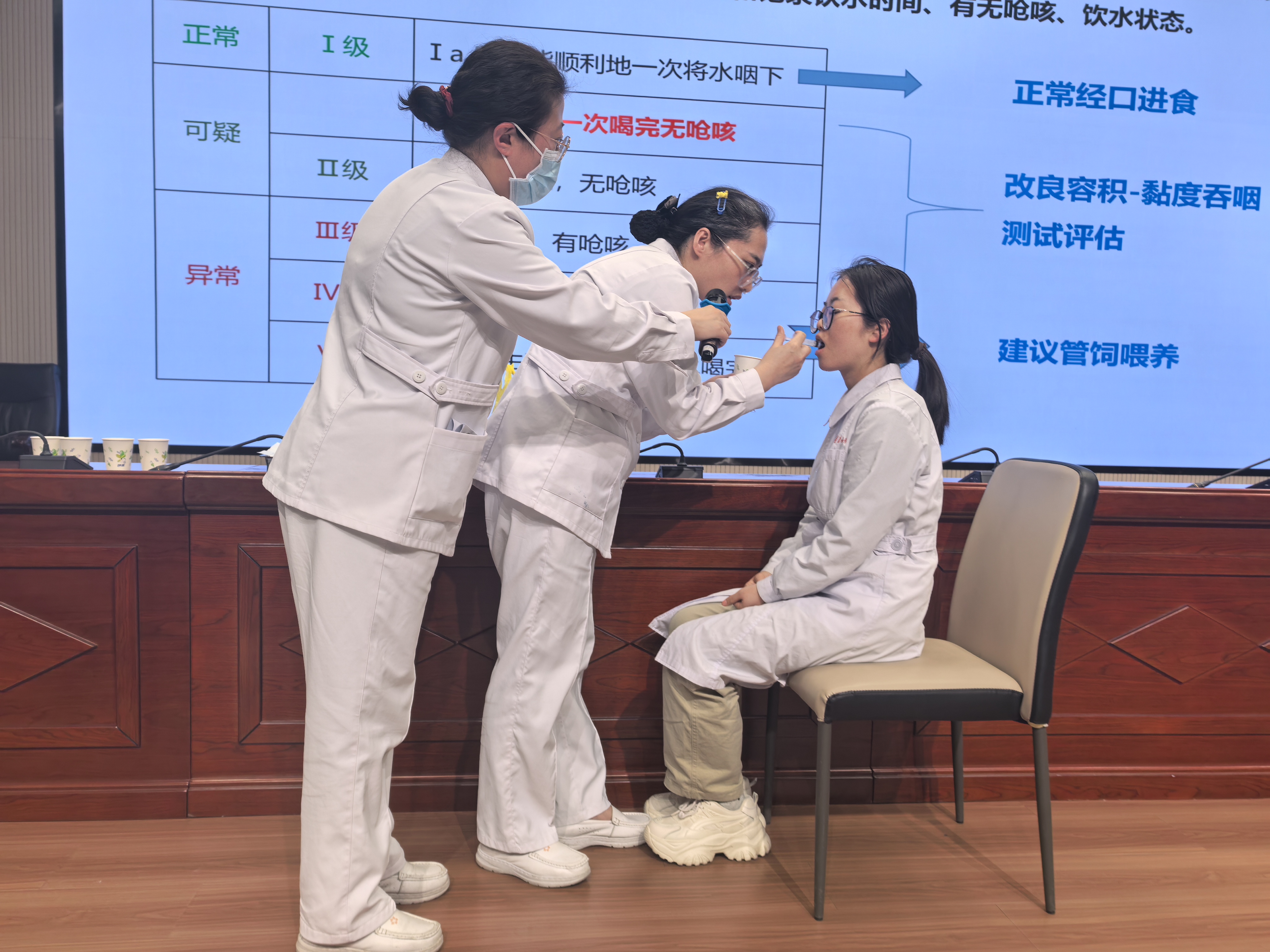 互动环节同样精彩纷呈。王雪婷护士长围绕针刺伤预防及处理组织现场答题,大家争相抢答,在轻松氛围中巩固了防范要点。张静护士长则带领科室护士童秀立,并邀请现场参培人员参与洼田饮水试验实操体验。通过现场演示吞咽功能评估方法,讲者手把手指导,参训人员踊跃尝试,在互动中加深了对操作要领的理解,掌声与讨论声此起彼伏,将培训气氛推向高潮。