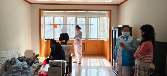 老人因年事已高、行动不便,近期出现视力下降,无法亲临医院。得知情况后,科室主动协调,组织上门服务。进门后,张小霞护士长一边为老人调整舒适体位,一边轻声安抚;护士长迅速架好便携式裂隙灯与眼底镜。戴雁主任在有限的条件下,凭借精湛技术,为老人细致检查了视力、眼前段及眼底情况,董鸿燕护士顺利完成泪道冲洗。整个操作轻柔熟练,老人未感明显不适。