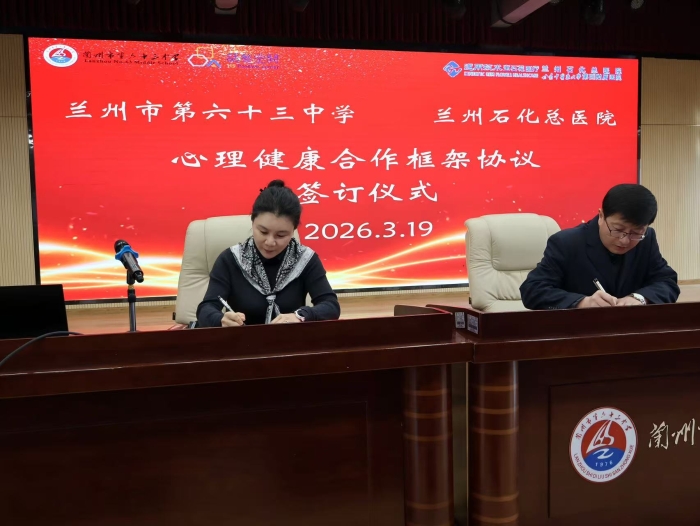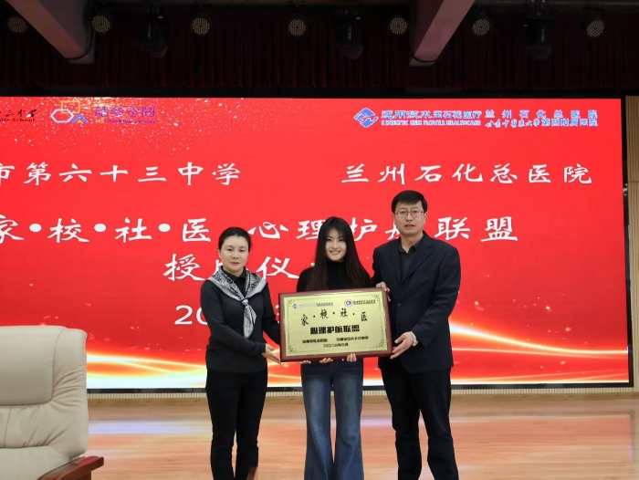 2026年3月19日,兰州石化总医院(甘肃中医药大学第四附属医院)与兰州市第六十三中学隆重举行"家·校·社·医"心理护航联盟签约授牌仪式暨教职工心理关爱活动,通过医校合作签约授牌与专题健康讲座,积极响应“精神卫生服务年”工作部署,为辛勤耕耘的园丁们送上一份"减压助眠"的暖心关怀,共同筑牢学生心理健康防线。