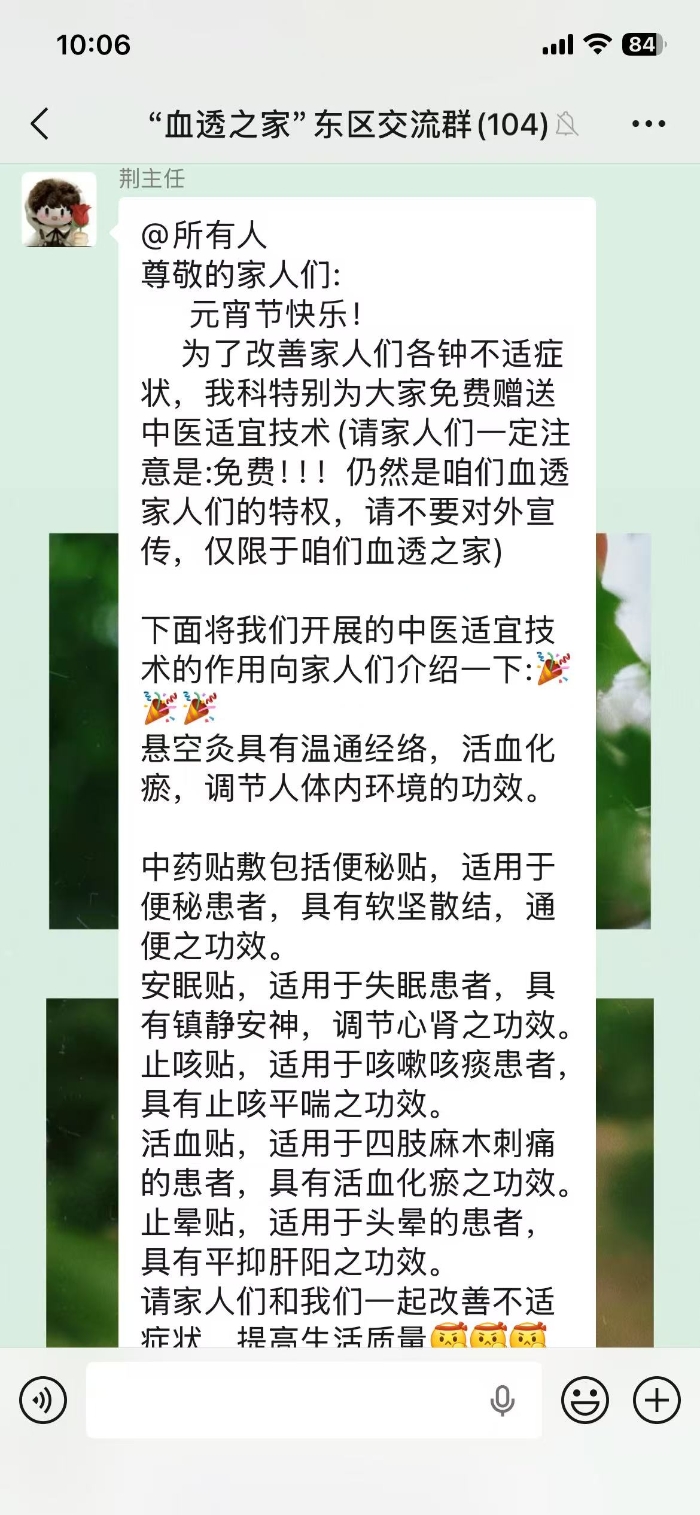 科室致力于打造有温度的医疗服务。从整洁舒适的透析环境,到细致入微的生活照料;从定期开展的健康宣教,到线上线下的病友交流,努力让每一位患者都能感受到家的温暖。“血透之家”交流群里,荆焰主任的暖心通知、医护的专业解答、病友间的相互鼓励,让这个特殊的群体不再孤单。
