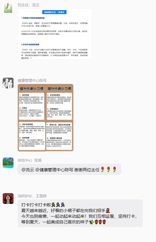 活动期间,护理部主任刘世云与健康管理中心主任陈写不定期在健康运动打卡群中分享活动方案和营养食谱,为大家提供科学指导与持续激励。群内互动热烈,大家互相鼓励、交流心得,健康减重氛围浓厚。