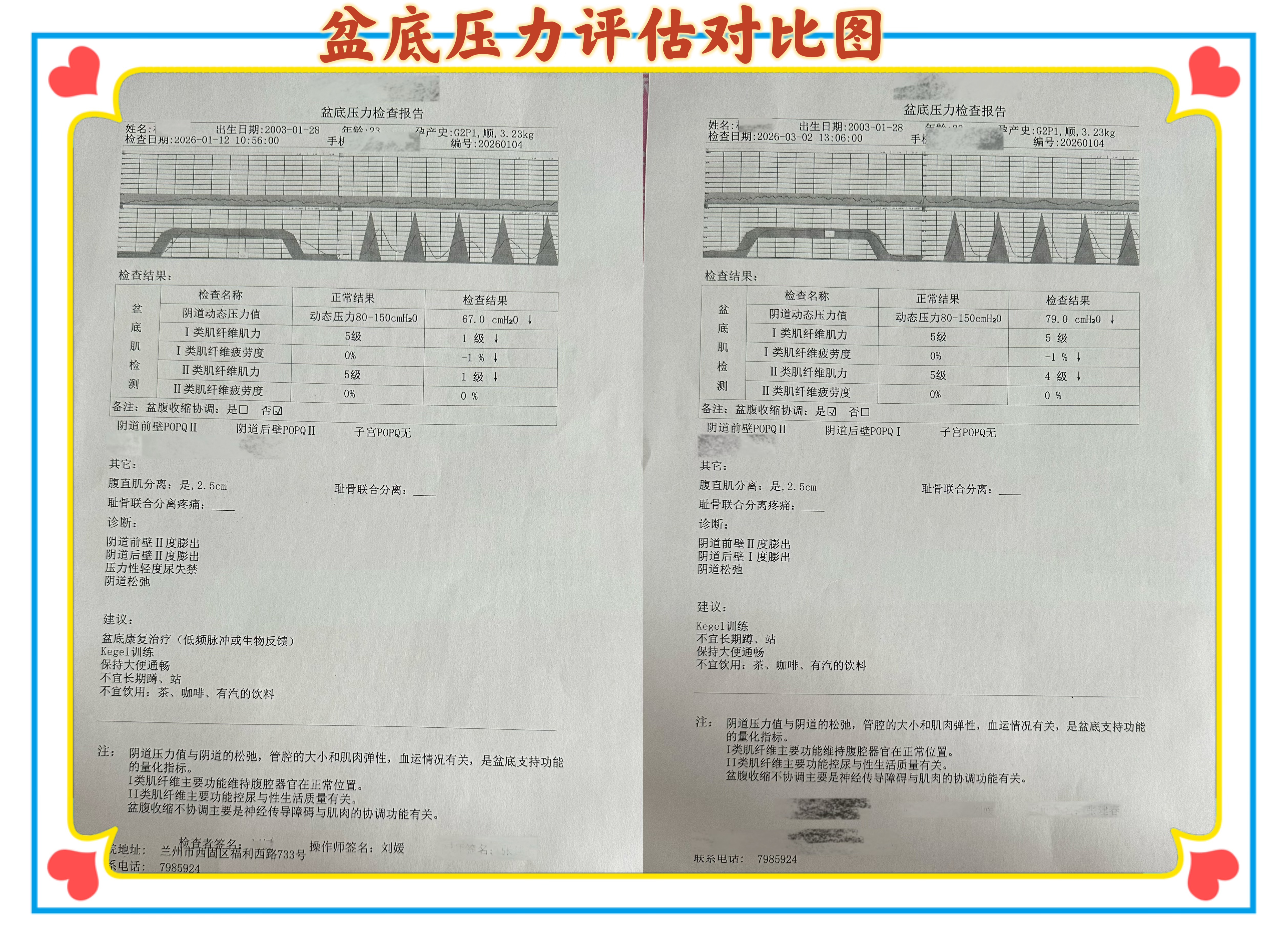 盆底康复中心的刘媛老师为杨女士进行了详细的盆底压力检查。报告显示,她的盆底功能存在多项异常:阴道动态压力值仅为67.0cmH₂O(正常值80-150cmH₂O),Ⅰ类肌纤维肌力1级(正常5级),Ⅱ类肌纤维肌力1级(正常5级),且存在阴道前后壁Ⅱ度膨出、腹直肌分离2.5cm等问题。这些数据清晰地揭示了杨女士漏尿的根源——盆底肌力严重不足,盆底支持功能减弱。