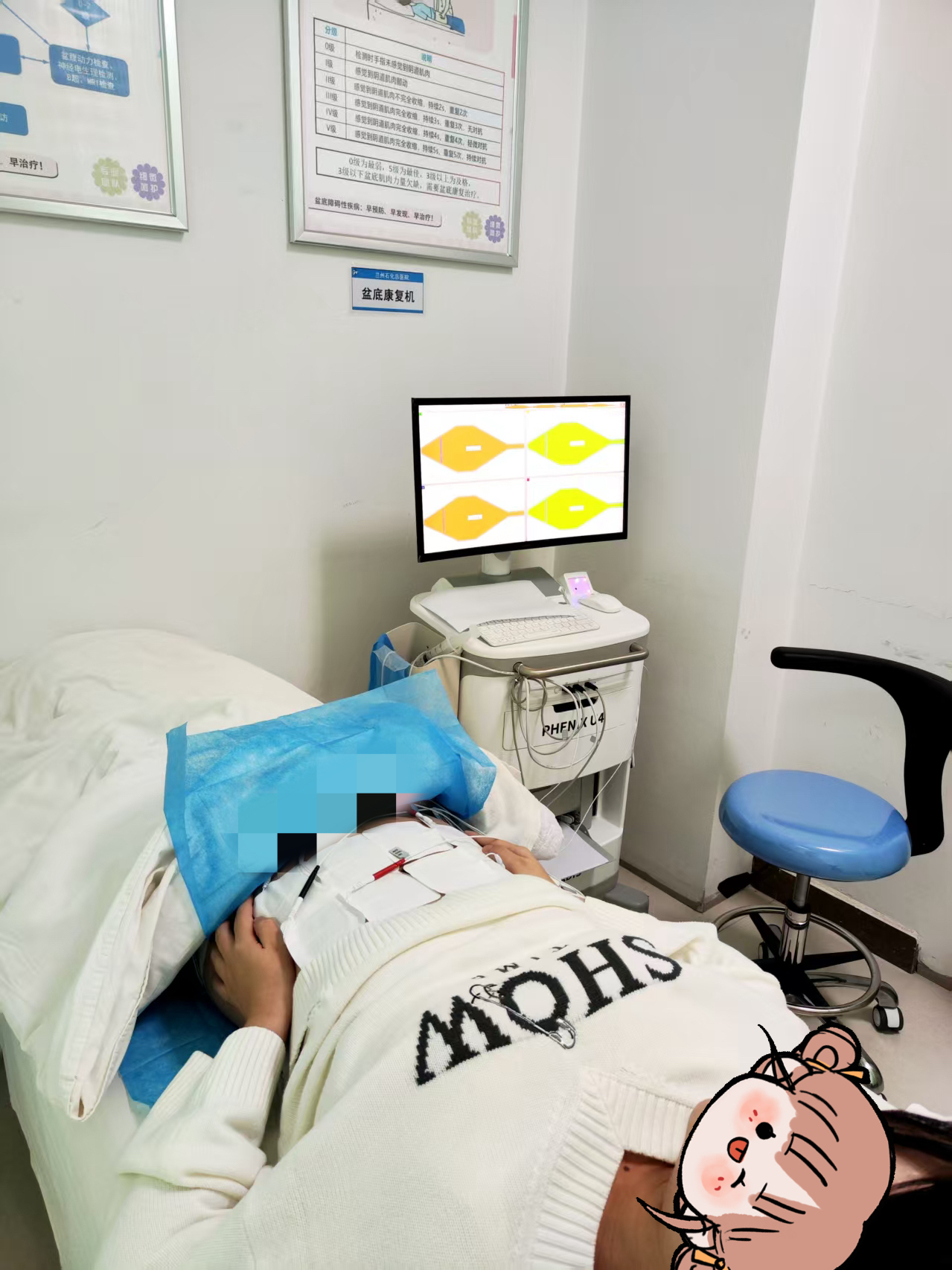 针对杨女士的情况,刘媛老师为她制定了个性化的盆底康复方案:结合低频脉冲电刺激与生物反馈技术,激活盆底肌肉神经,增强肌力;指导进行Kegel训练,强化盆底肌肉的自主收缩能力;同时给予生活指导,如保持大便通畅、避免长期蹲站、减少茶咖啡等刺激性饮品摄入。
