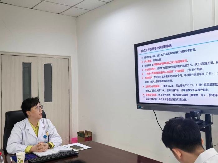 杜维翠护士长汇报了危重症、静疗、伤口等8个专科护理发展组的工作进展。各小组按照部署有序推进各项工作,专科护理能力持续提升。下一步将加强质量管理工具应用培训,完善新技术、新业务的护理规范,推动专科护理精细化、标准化。
