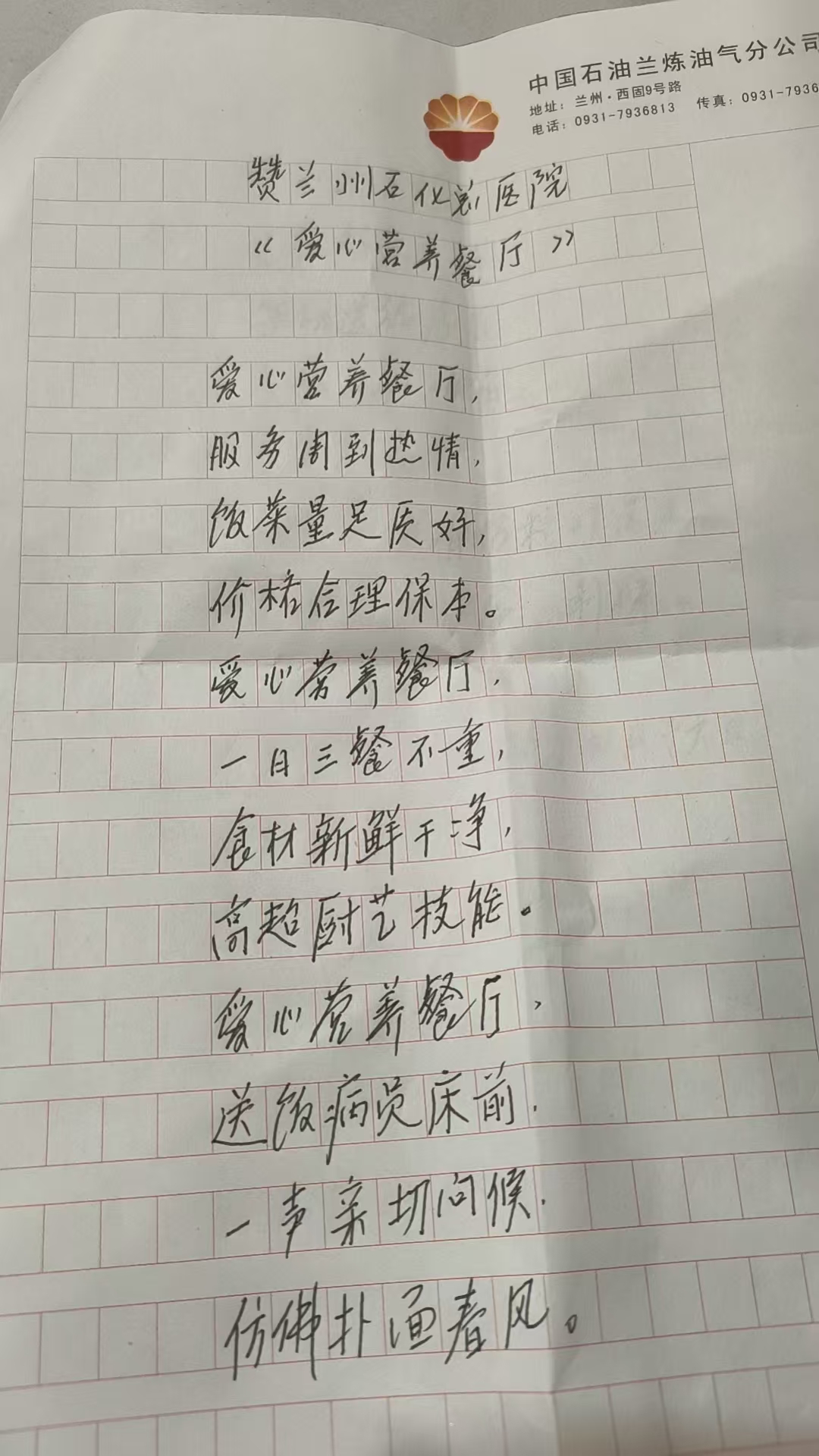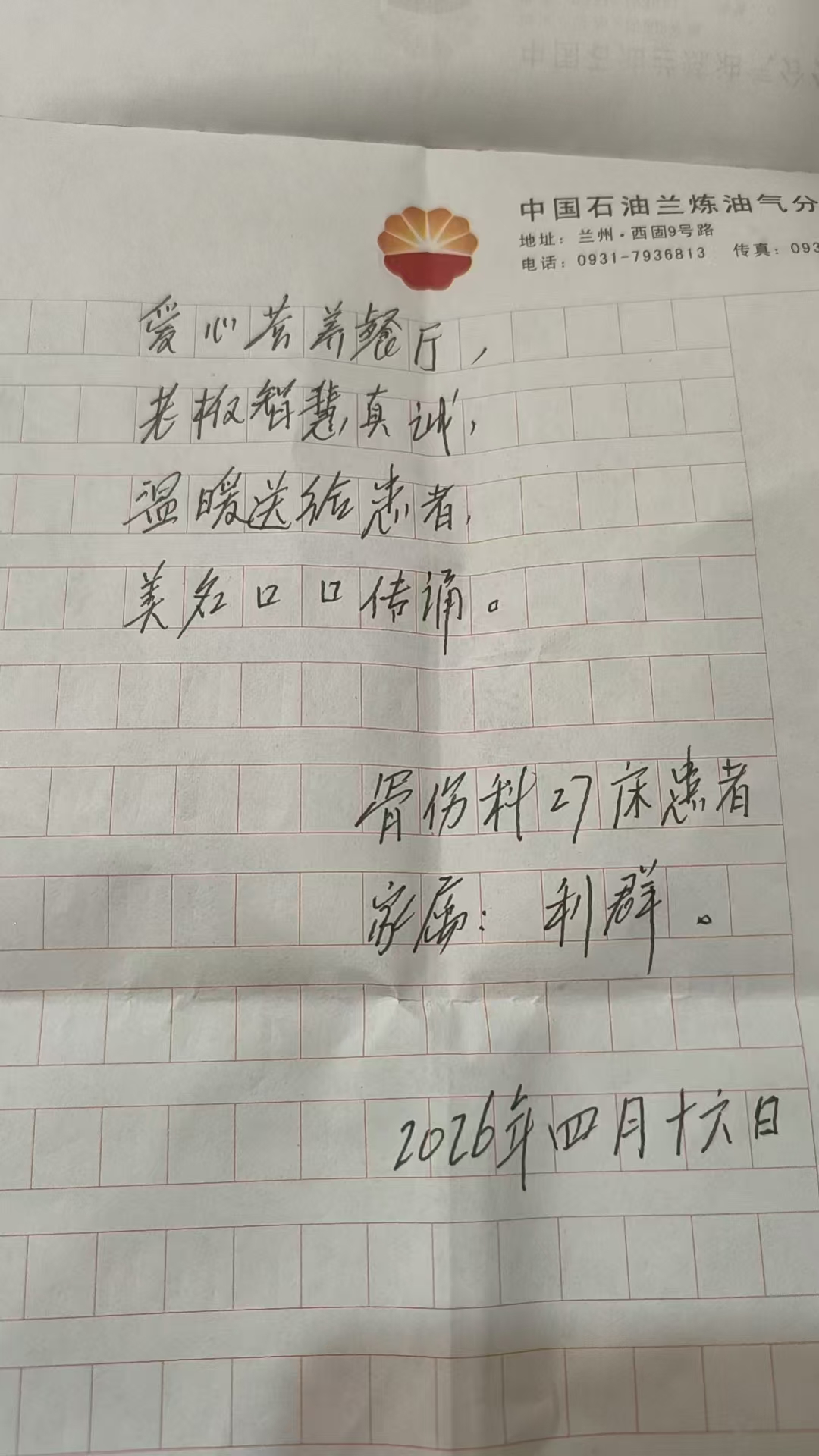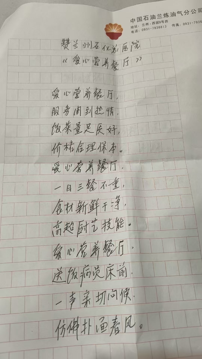医院后勤工作,是医疗服务的重要延伸,而食堂服务更是与患者的康复息息相关、紧密相连。兰州石化总医院(甘肃中医药大学第四附属医院)后勤服务部始终坚信,一份温热、营养、适宜的餐食,不仅能补充患者身体所需,更能慰藉患者的心灵,为大家战胜病痛增添力量。4月24日,医院“爱心营养”食堂收到了一封来自骨伤科患者的手写表扬信,两张轻盈的信纸承载的却是沉沉的暖意。