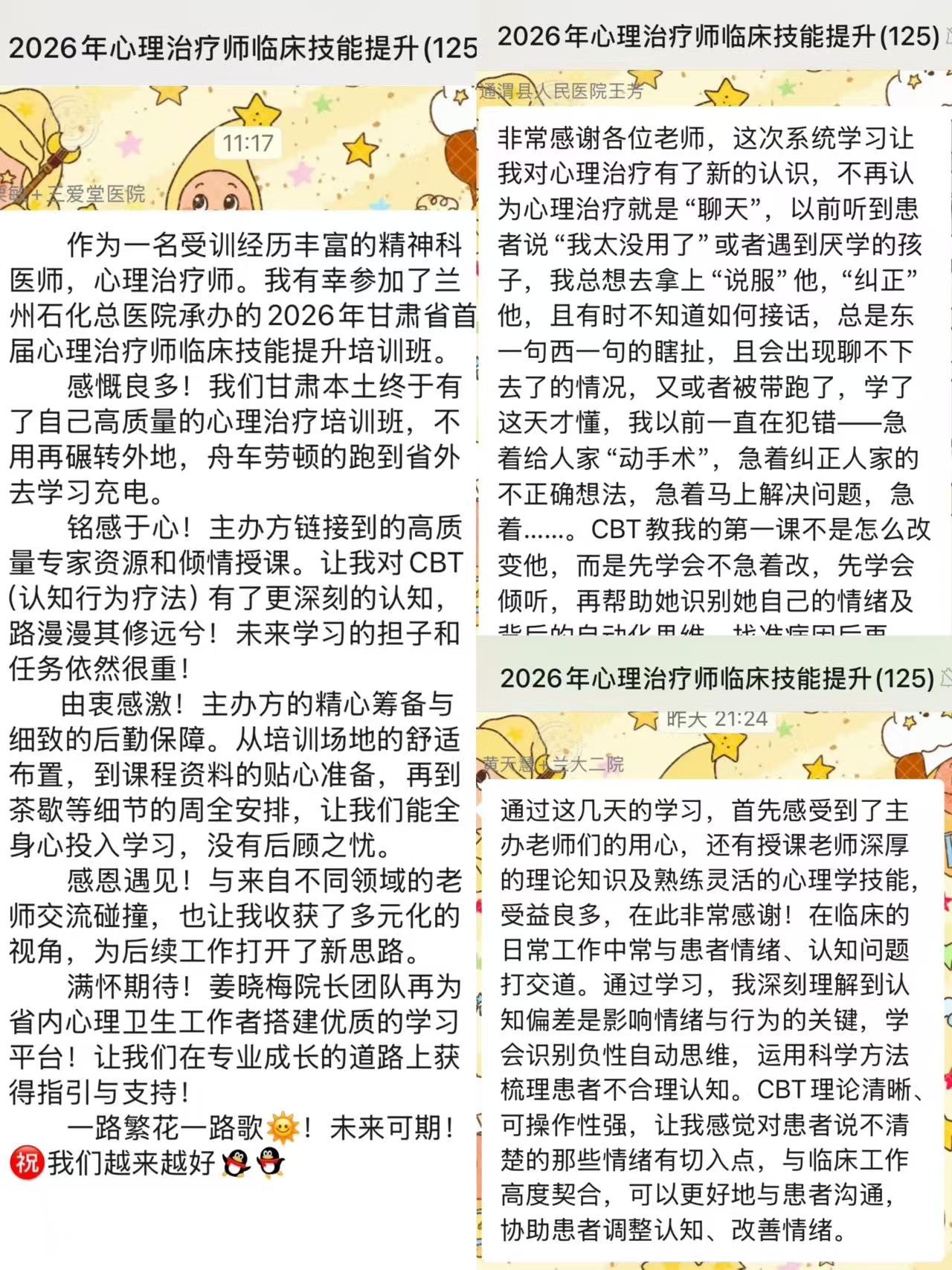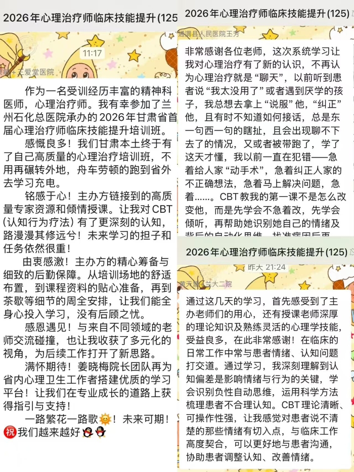 参训学员纷纷表示,此次培训紧贴临床工作实际,既补齐了理论短板,又强化了实操技能,通过系统学习、作业巩固与考核检验,进一步明确了心理治疗工作的职业规范与技术路径,提升了临床服务能力与专业素养。大家将以此次培训为新起点,把所学知识与技能运用到实际工作中,切实把培训成果转化为服务群众心理健康的实际成效。