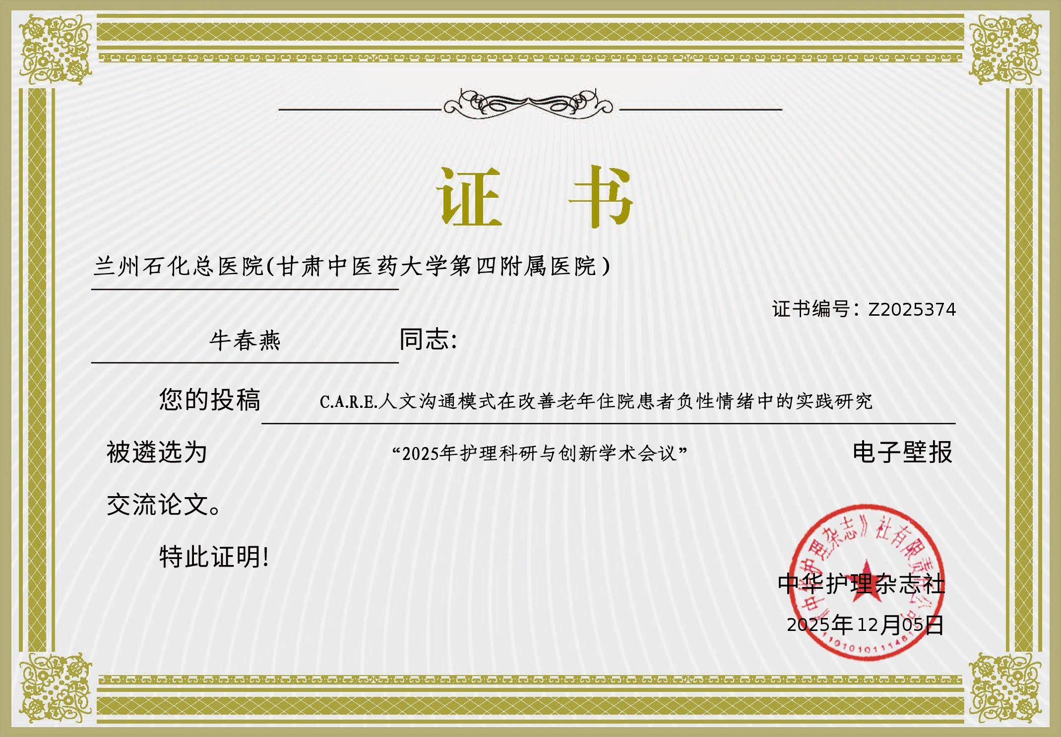 【喜报】兰州石化总医院呼吸科论文入选2025年护理科研与创新学术会议壁报交流 近日,中华护理杂志社主办的“2025年护理科研与创新学术会议暨中华护理杂志社系列期刊编委工作会议”在安徽合肥举办,我院呼吸科完成的《C.A.R.E.人文沟通模式在改善老年住院患者负性情绪中的实践研究》成...