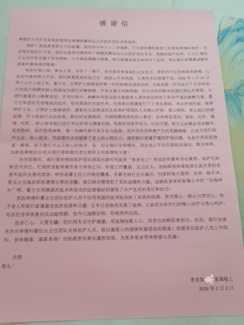 近日,兰州石化总医院疼痛科瞿创业主任带领的医护团队,收到了一份满载真情的新年礼物——患者欧文兰家属送来的锦旗与感谢信。鲜红的锦旗上,“医德高尚医术精,关爱病患暖人心”十二个鎏金大字熠熠生辉,字里行间满是患者及家属对医护团队的真挚谢意与高度认可。 患者欧奶奶已是82岁高龄,不久前因...