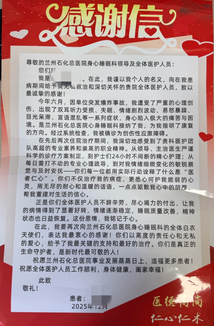 “真没想到,不到一个月,我竟然完全好了!”12 月 29 日下午,刘女士复诊时为西固区精神卫生中心兰州石化总医院(甘肃中医药大学第四附属医院)席彩琴医生写下一份感谢信。信纸不过三行,却写满对西固区精神卫生中心—辽阳辽化医院两院联合“心身睡眠门诊”的由衷点赞,也为西固区精神卫生中心...