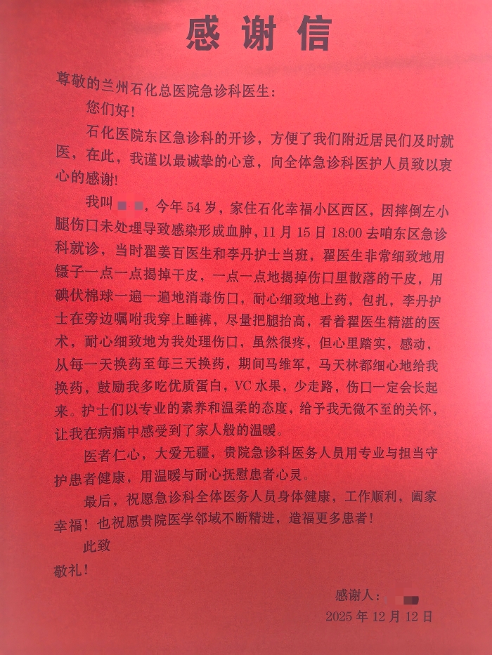 近日,兰州石化总医院急诊科收到一封情真意切的感谢信,信中质朴的语言传递着患者对医护人员真挚的感激之情。这份认可的背后,是一段关于专业救治与人文关怀并重的暖心故事。上个月,一名下肢皮肤感染的患者来到兰州石化总医院东区急诊科就诊。当时,患者下肢感染严重,伤口周围红肿明显,伴有剧烈疼痛...