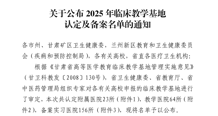 2026年1月21 日,兰州石化总医院(甘肃中医药大学第四附属医院)传来振奋人心的喜讯——经甘肃省卫生健康委员会、甘肃省教育厅联合组织的严格评审,兰州石化总医院已成功通过甘肃省高等医学教育临床教学基地复审,被继续认定为甘肃中医药大学第四附属医院,有效期五年(自2026年1月8日起...